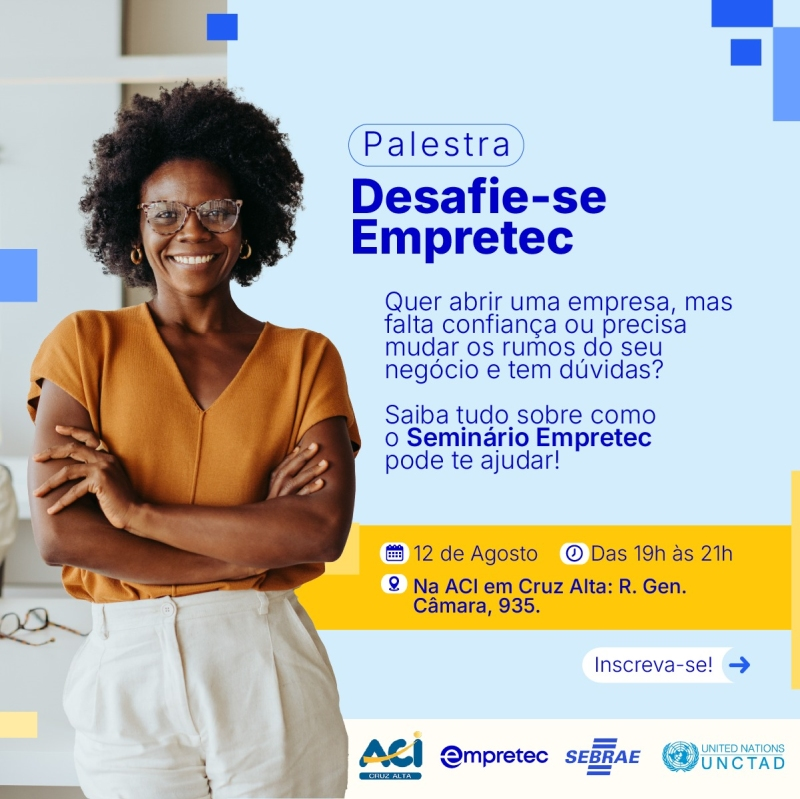 O Sebrae RS e a Associação Comercial e Industrial de Cruz Alta (ACI) estão com inscrições abertas para a edição 2025 do Empretec, considerado o principal programa de formação de empreendedores do mundo. Desenvolvido pela Organização das Nações Unidas (ONU) e realizado no Brasil com exclusividade pelo Sebrae, o seminário será promovido em Cruz Alta de 8 a 12 de setembro, em uma única turma. Antes disso, os interessados poderão participar da palestra gratuita de sensibilização “Desafie-se – Empretec”, que será realizada no dia 12 de agosto, às 19h, na sede da ACI (Rua Gen. Câmara, 935). A atividade tem duas horas de duração e apresenta os pilares da metodologia, os conteúdos trabalhados e os diferenciais do programa, com exemplos práticos de como o Empretec pode transformar a trajetória empreendedora dos participantes. As inscrições para a palestra podem ser feitas gratuitamente pelo formulário: https://forms.office.com/r/WnGszLR8bG. Após a palestra, os interessados passam por entrevista individual e, se aprovados, poderão garantir vaga no seminário completo. Com 60 horas de imersão intensiva, o Empretec desenvolve dez características comportamentais de empreendedores de sucesso, como iniciativa, persistência, busca de oportunidades, comprometimento e autoconfiança. A formação inclui dinâmicas práticas e reflexões voltadas à transformação pessoal e profissional, sendo indicada tanto para quem já empreende quanto para quem deseja começar com planejamento estratégico.