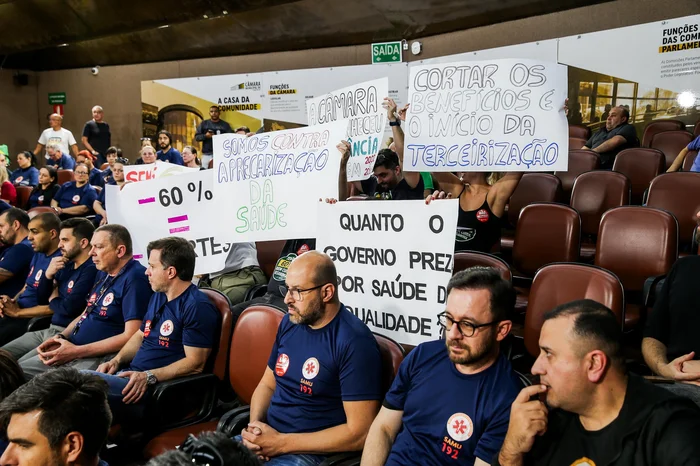 Servidores do Samu lotaram, na tarde desta segunda (24), a reunião pública da Comissão de Saúde da Câmara de Caxias do Sul. Com faixas e cartazes, o protesto mirou a proposta da Secretaria Municipal da Saúde de reduzir custos no serviço, especialmente a possibilidade de diminuição da gratificação paga aos profissionais, hoje entre 40% e 60% conforme o grau de insalubridade.