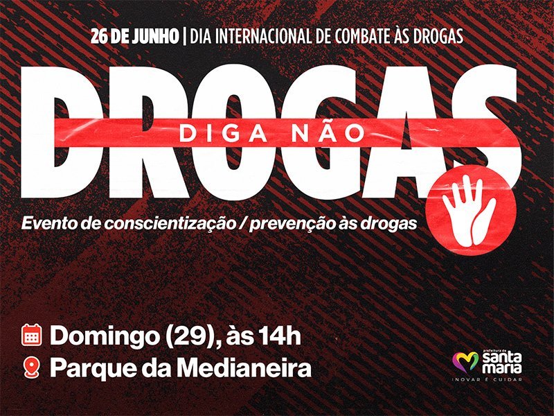 Neste domingo (29), Santa Maria promove uma tarde de conscientização e diálogo sobre os impactos do uso de drogas, em alusão ao Dia Internacional de Combate às Drogas, celebrado em 26 de junho. O evento ocorre a partir das 14h, no Parque da Medianeira, com atividades abertas à comunidade.