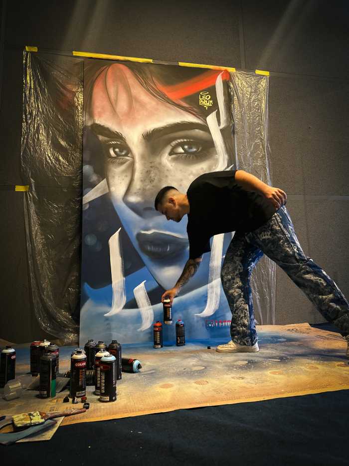 Essa visão também aproxima seu trabalho da arquitetura. Léo não entrega apenas arte: entrega ambiente e identidade. E sua atuação vai além das paredes. As performances de live paint, em que cria telas ao vivo durante eventos, ampliam a relação entre público, processo e criação.